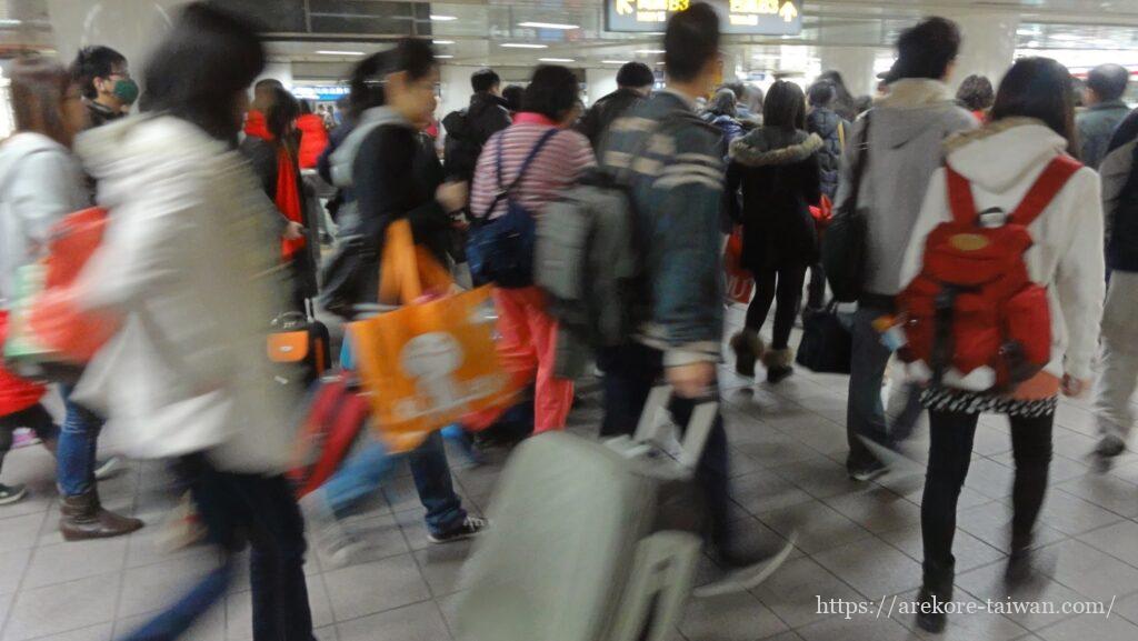 連休初日台北駅は写真のように大きな荷物を持つ人で大混雑します。