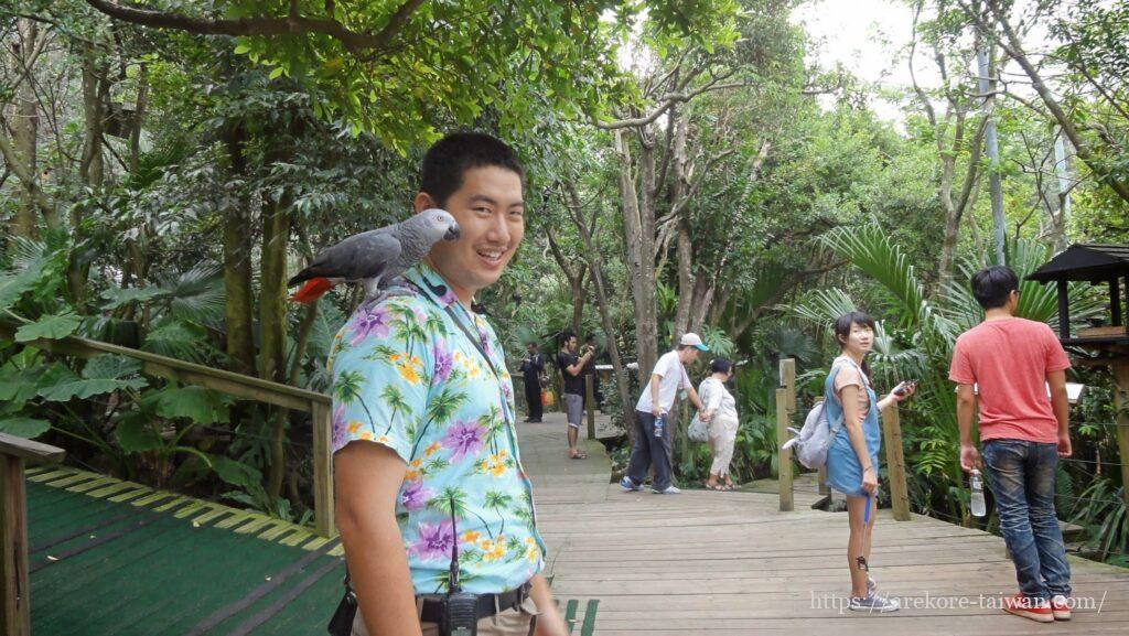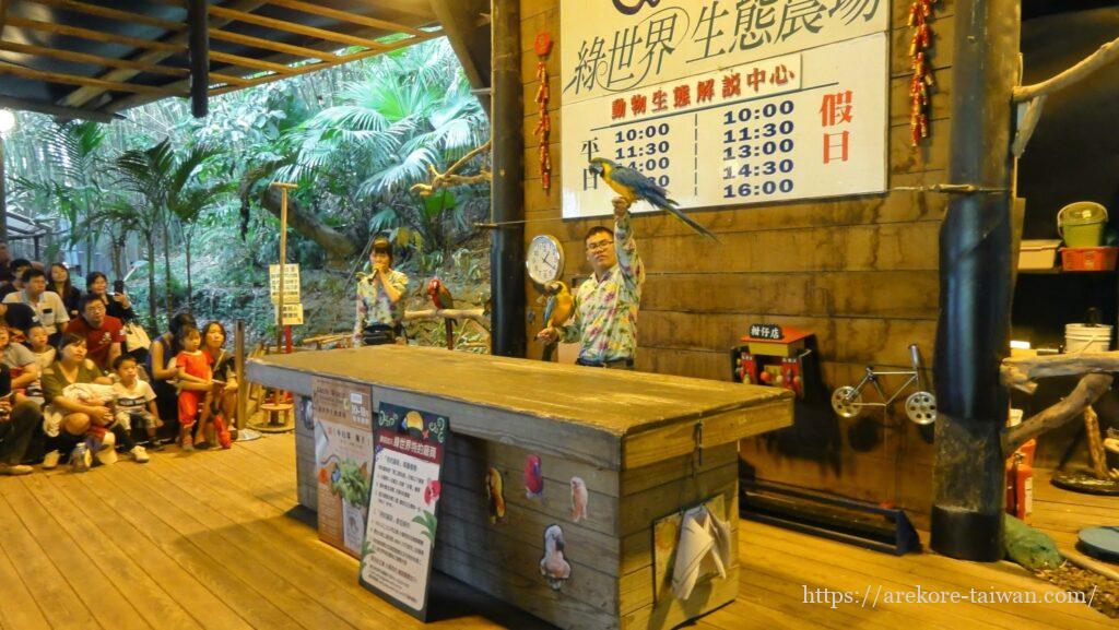 昼食を食べながらインコの曲芸ショーも楽しむことができ