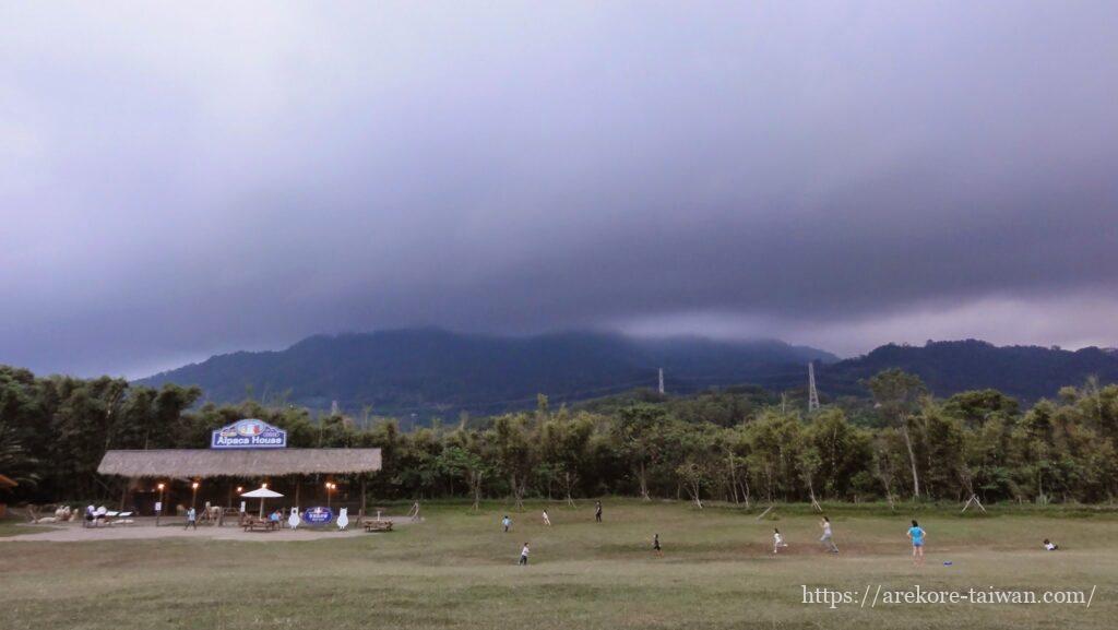 空が暗くなってきて山の向こうでは夕立が降っているようなので