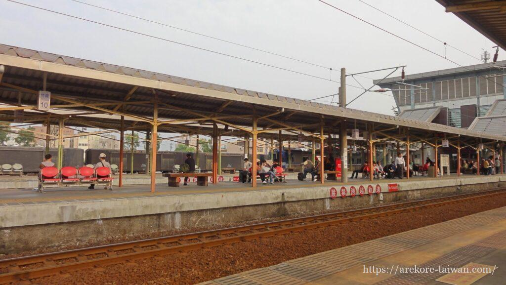 古い駅舎が特徴的な茜射す竹南駅のホーム。