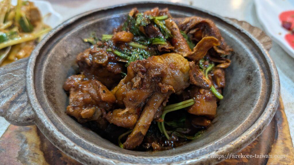 三杯雞(sān bēi jī=生姜・醤油・みりん・パクチーで鶏肉を炒めたもの)