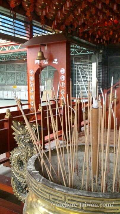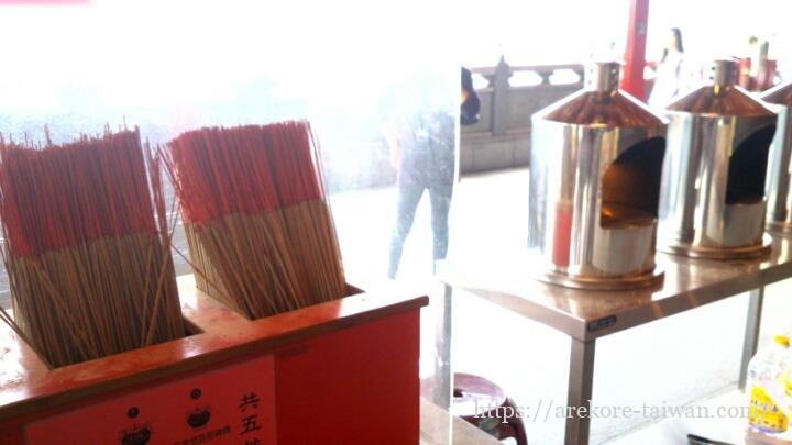 長い台湾式のお線香を5本とってそれぞれ火をつけて