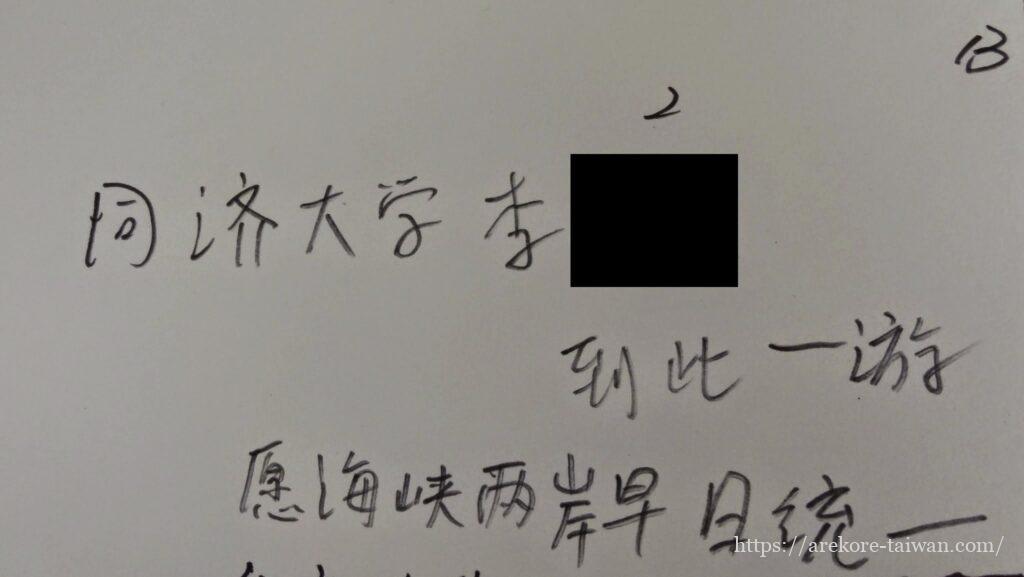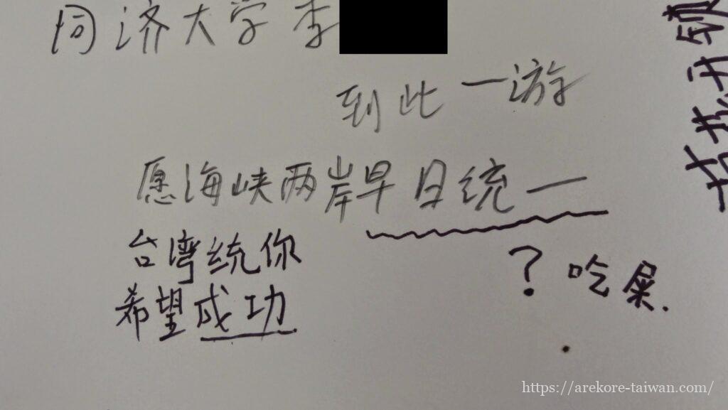 「同済大学 李●● 此処に遊びに来た 一日も早い両岸(中国と台湾)の統一を願う」