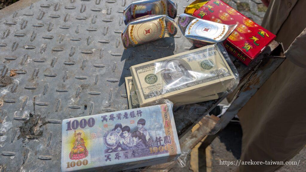 供養用に作られた新台湾ドルや米ドルを模した紙に加え