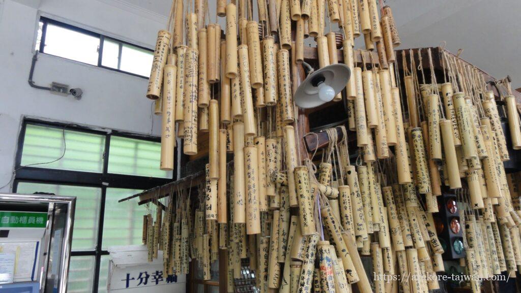 駅の改札には願い事を書いた竹が大量に吊るされています。