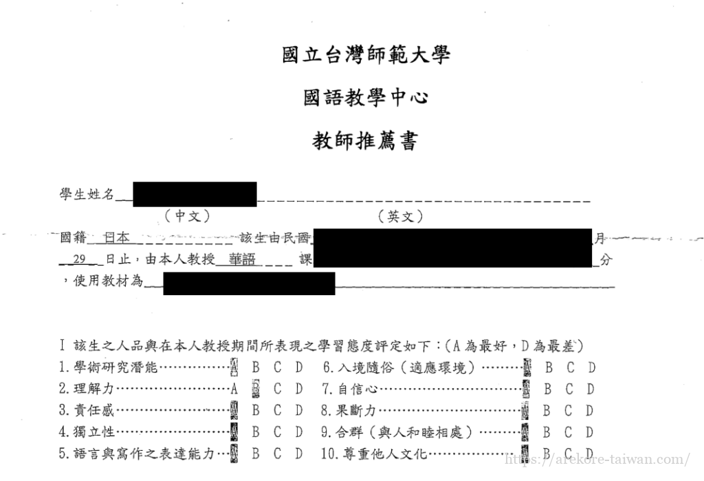 華語文能力測験(TOCFL)進階級以上の合格証明書と成績表のコピー
