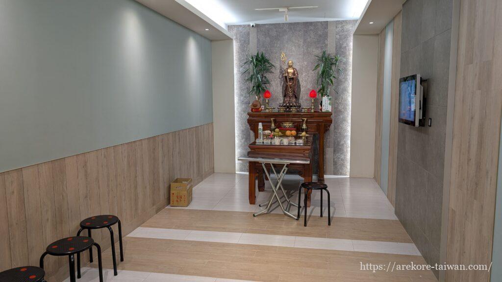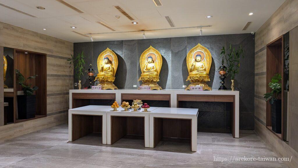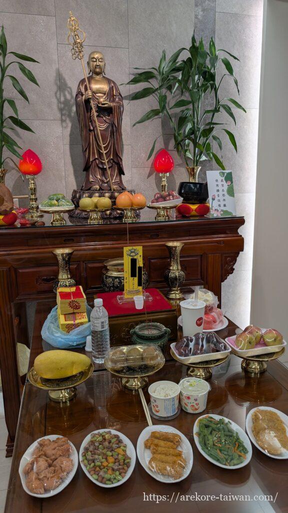 仏像の前方に故人に供する食べ物や飲み物を配置すると